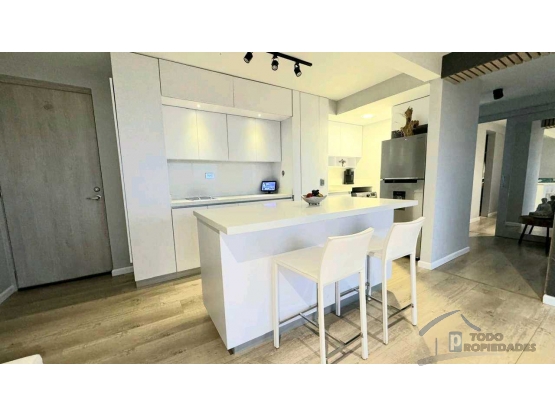 El apartamento cuenta con 58 metros cuadrados (por validar en escrituras),  distriduidos en 1 habitacion, estudio o segunda habitación, vestier, baño, sala, comedor, cocina abierta, zona de ropas independiente y balcón con dos Black outs automáticos.